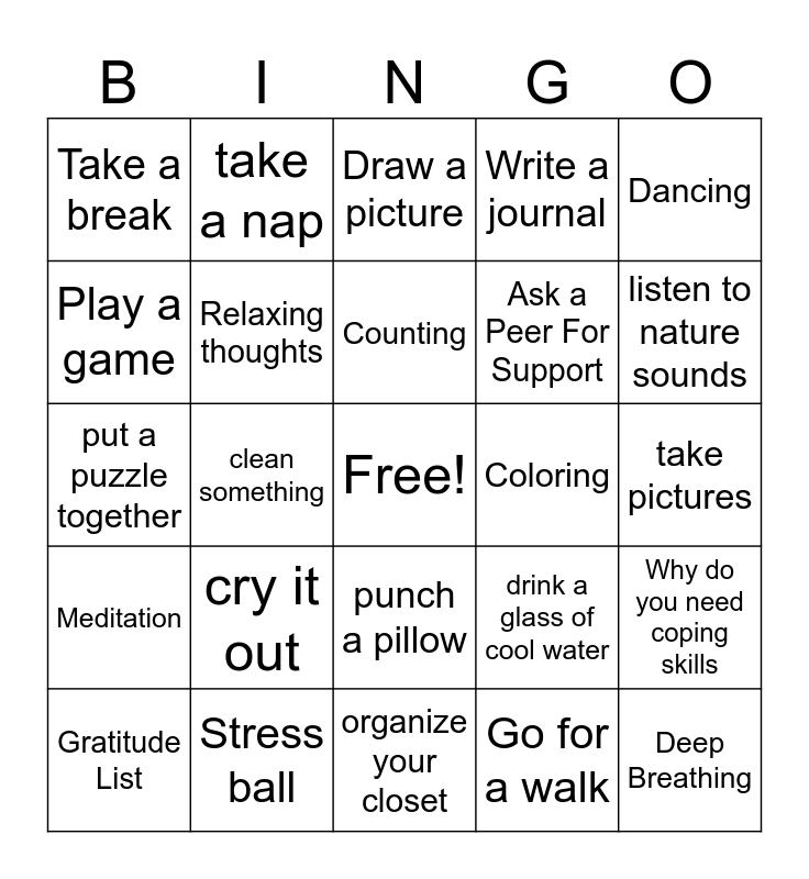 This bingo card has a free space and 59 words: walk your dog, Stress ball, Positive attitude, Meditation, Go for a walk, Listen to music, Relaxing thoughts, When do you need coping skills, Ask a Peer For Support, Yoga, Write a journal, Read a book, Play a game, Name 2 coping skills that you use, Gym, Take a break, Deep Breathing, Dancing, Exercise, Counting, Coloring, Draw a picture, Gratitude List, Why do you need coping skills, Run, build with legos, paint, read inspirational quotes, listen to nature sounds, Play sports, Stretch, Close your eyes and relax, visualize your favorite place, play with a pet, take a nap, set a goal, write in a journal, clean something, Meditate, put a puzzle together, play an instrument, cry it out, take pictures, sit outside, paint your nails, do a craft, bake something, take a hot shower, punch a pillow, organize your closet, notice 5 things you can see, drink some tea, play a card game, relax all of your muscles, Practice yoga, drink a glass of cool water, cook a meal, write a poem and squeeze a stress ball.