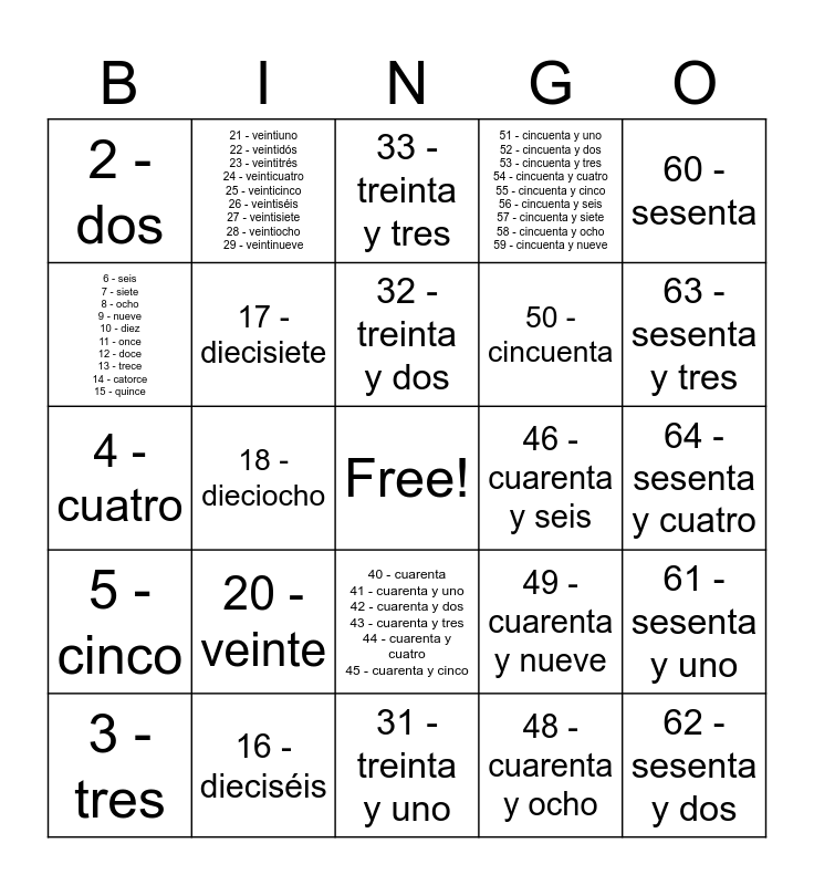 This bingo card has a free space and 29 words: 1 - uno, 16 -dieciséis, 33 - treinta y tres, 47 - cuarenta y siete, 60 - sesenta, 2 - dos, 17 - diecisiete, 32 - treinta y dos, 46 - cuarenta y seis, 61 - sesenta y uno, 3 - tres, 18 - dieciocho, 48 - cuarenta y ocho, 62 - sesenta y dos, 4 - cuatro, 19 -diecinueve, 31 - treinta y uno, 49 - cuarenta y nueve, 63 - sesenta y tres, 5 - cinco, 20 - veinte, 30 - treinta, 50 - cincuenta, 64 - sesenta y cuatro, 6 - seis 7 - siete 8 - ocho 9 - nueve 10 - diez 11 - once 12 - doce 13 - trece 14 - catorce 15 - quince, 21 - veintiuno 22 - veintidós 23 - veintitrés 24 - veinticuatro 25 - veinticinco 26 - veintiséis 27 - veintisiete 28 - veintiocho 29 - veintinueve, 40 - cuarenta 41 - cuarenta y uno 42 - cuarenta y dos 43 - cuarenta y tres 44 - cuarenta y cuatro 45 - cuarenta y cinco, 51 - cincuenta y uno 52 - cincuenta y dos 53 - cincuenta y tres 54 - cincuenta y cuatro 55 - cincuenta y cinco 56 - cincuenta y seis 57 - cincuenta y siete 58 - cincuenta y ocho 59 - cincuenta y nueve and 65 - sesenta y cinco 66 - sesenta y seis 67 - sesenta y siete 68 - sesenta y ocho 69 - sesenta y nueve 70 - setenta 71 - setenta y uno 72 - setenta y dos 73 - setenta y tres 74 - setenta y cuatro 75 - setenta y cinco.
