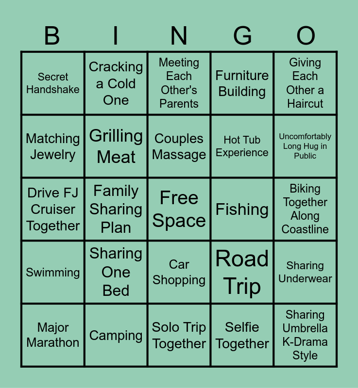 This bingo card has a free space and 24 words: Sharing One Bed, Camping, Couples Massage, Major Marathon, Giving Each Other a Haircut, Secret Handshake, Matching Jewelry, Cracking a Cold One, Fishing, Car Shopping, Hot Tub Experience, Drive FJ Cruiser Together, Road Trip, Sharing Underwear, Grilling Meat, Selfie Together, Biking Together Along Coastline, Meeting Each Other's Parents, Uncomfortably Long Hug in Public, Family Sharing Plan, Sharing Umbrella K-Drama Style, Swimming, Furniture Building and Solo Trip Together.