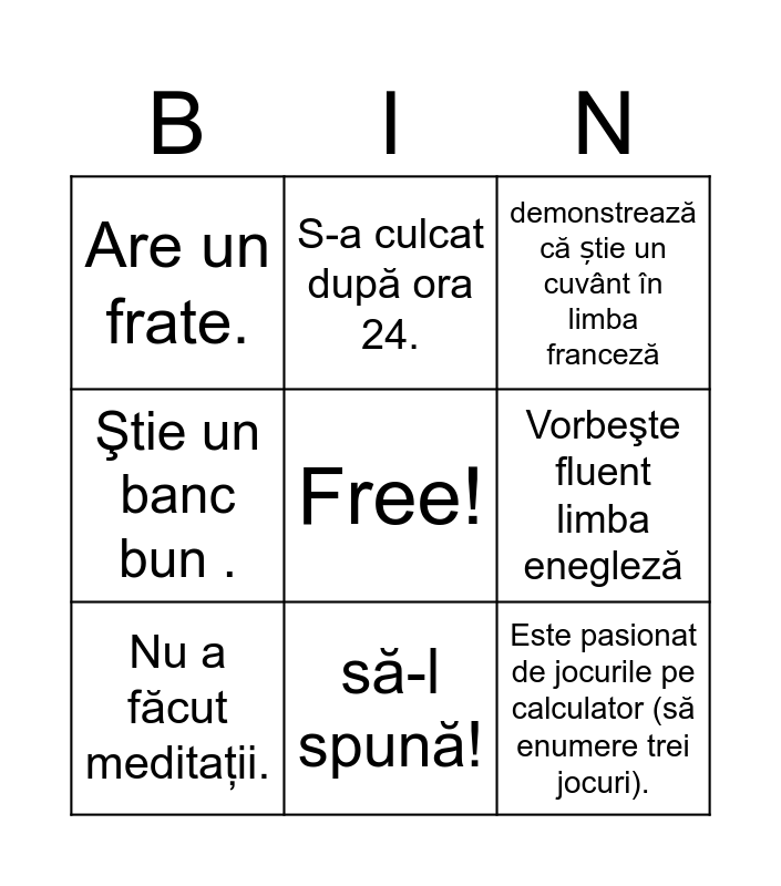 This bingo card has a free space and 8 words: Vorbeşte fluent limba enegleză, demonstrează că știe un cuvânt în limba franceză, S-a culcat după ora 24., Nu a făcut meditaţii., Are un frate., Este pasionat de jocurile pe calculator (să enumere trei jocuri)., Ştie un banc bun . and să-l spună!.