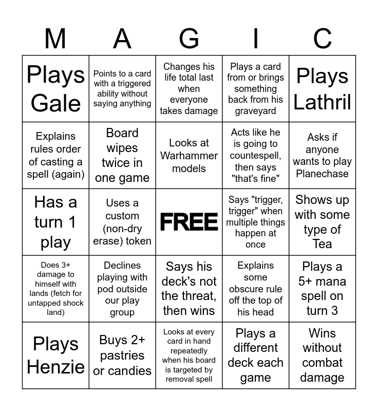 This bingo card has a free space and 24 words: Declines playing with pod outside our play group, Buys 2+ pastries or candies, Looks at Warhammer models, Plays Henzie, Plays Lathril, Plays Gale, Explains rules order of casting a spell (again), Points to a card with a triggered ability without saying anything, Says "trigger, trigger" when multiple things happen at once, Says his deck's not the threat, then wins, Acts like he is going to countespell, then says "that's fine", Has a turn 1 play, Explains some obscure rule off the top of his head, Plays a 5+ mana spell on turn 3, Board wipes twice in one game, Plays a different deck each game, Shows up with some type of Tea, Changes his life total last when everyone takes damage, Asks if anyone wants to play Planechase, Uses a custom (non-dry erase) token, Wins without combat damage, Does 3+ damage to himself with lands (fetch for untapped shock land), Plays a card from or brings something back from his graveyard and Looks at every card in hand repeatedly when his board is targeted by removal spell.