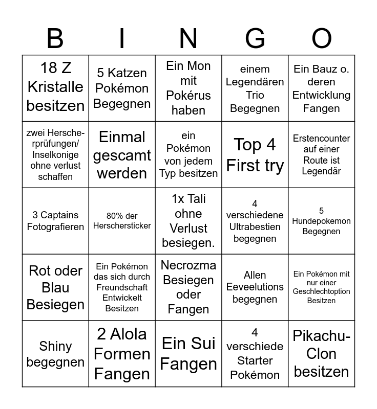 This bingo card has a free space and 24 words: Ein Pokémon das sich durch Freundschaft Entwickelt Besitzen, 2 Alola Formen Fangen, ein Pokémon von jedem Typ besitzen, Shiny begegnen, Ein Bauz o. deren Entwicklung Fangen, 18 Z Kristalle besitzen, zwei Hersche-rprüfungen/ Inselkonige ohne verlust schaffen, 5 Katzen Pokémon Begegnen, 4 verschiedene Ultrabestien begegnen, Necrozma Besiegen oder Fangen, Top 4 First try, 3 Captains Fotografieren, Allen Eeveelutions begegnen, Ein Pokémon mit nur einer Geschlechtoption Besitzen, Einmal gescamt werden, 4 verschiede Starter Pokémon, 5 Hundepokemon Begegnen, Ein Mon mit Pokérus haben, Erstencounter auf einer Route ist Legendär, 80% der Herschersticker, Pikachu-Clon besitzen, Rot oder Blau Besiegen, einem Legendären Trio Begegnen and Ein Sui Fangen.