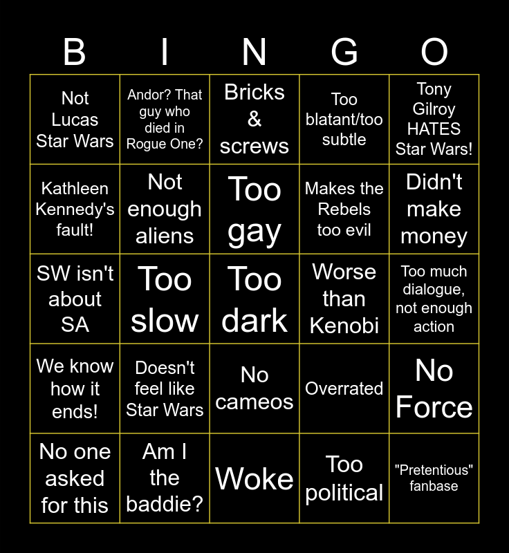 This bingo card has 31 words: Woke, Nobody watched it, Too slow, Disney SW, automatically bad, Not Lucas Star Wars, Bricks & screws, Not enough aliens, Overrated, Worse than Kenobi, Too political, Too much dialogue, not enough action, Too dark, "Pretentious" fanbase, It's boring!, Didn't make money, No Jedi/Sith, No Force, Doesn't feel like Star Wars, We know how it ends!, No cameos, Tony Gilroy HATES Star Wars!, Cereal scenes!, No one asked for this, Andor? That guy who died in Rogue One?, Makes the Rebels too evil, Kathleen Kennedy's fault!, Too blatant/too subtle, SW isn't about SA, Am I the baddie?, Too gay and Recasting Bail Organa.