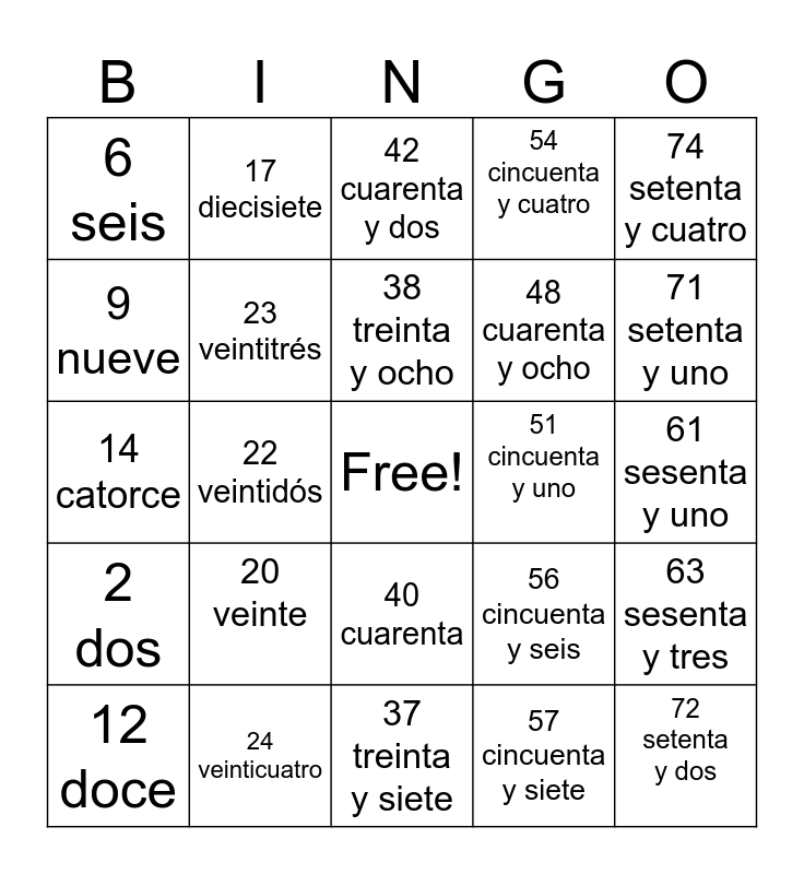 This bingo card has a free space and 46 words: 1 uno, 24 veinticuatro, 36 treinta y seis, 47 cuarenta y siete, 61 sesenta y uno, 2 dos, 17 diecisiete, 32 treinta y dos, 48 cuarenta y ocho, 73 setenta y tres, 9 nueve, 23 veintitrés, 57 cincuenta y siete, 63 sesenta y tres, 4 - cuatro, 19 iecinueve, 38 treinta y ocho, 51 cincuenta y uno, 64 sesenta y cuatro, 6 seis, 20 veinte, 34 treinta y cuatro, 54 cincuenta y cuatro, 74 setenta y cuatro, 7 siete, 22 veintidós, 55 cincuenta y cinco, 67 sesenta y siete, 37 treinta y siete, 56 cincuenta y seis, 68 sesenta y ocho, 25 veinticinco, 39 treinta y nueve, 58 cincuenta y ocho, 70 setenta, 40 cuarenta, 71 setenta y uno, 12 doce, 27 veintisiete, 60 sesenta, 72 setenta y dos, 42 cuarenta y dos, 14 catorce, 29 veintinueve, 43 cuarenta y tres and 45 cuarenta ycinco.