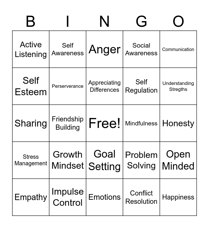 This bingo card has a free space and 24 words: Growth Mindset, Impulse Control, Appreciating Differences, Empathy, Communication, Active Listening, Self Esteem, Self Awareness, Mindfulness, Goal Setting, Self Regulation, Sharing, Problem Solving, Open Minded, Perserverance, Conflict Resolution, Honesty, Anger, Understanding Stregths, Friendship Building, Happiness, Stress Management, Social Awareness and Emotions.