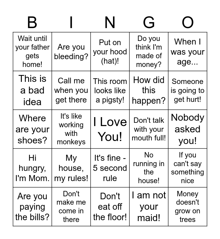 This bingo card has a free space and 44 words: Because I said so!, My house, my rules!, You'll be fine, I am not your maid!, Look at me when I'm talking to you., Go to your room!, Call me when you get there, I'm going to count to 3!, Do you think I'm made of money?, Money doesn't grow on trees, Wait until your father gets home!, Don't make me come in there, No running in the house!, Nobody asked you!, Get out of my kitchen!, I will turn this car around!, Don't eat off the floor!, Don't talk with your mouth full!, I'm not paying to heat the outside!, Where are your shoes?, Are you bleeding?, It's fine - 5 second rule, Life isn't fair!, When I was your age..., Go ask your father!, I don't care who started it, This room looks like a pigsty!, The apple doesn't fall far from the tree, If you can't say something nice, Are you paying the bills?, Button up your coat!, Put on your hood (hat)!, What were you thinking?, You can't always get what you want, Hi hungry, I'm Mom., No shoes in the house, "I don't know" is not a meal, Go away, crazy!, Someone is going to get hurt!, This is a bad idea, It's like working with monkeys, I will wash your mouth out with soap!, How did this happen? and Is it going to clean itself?.