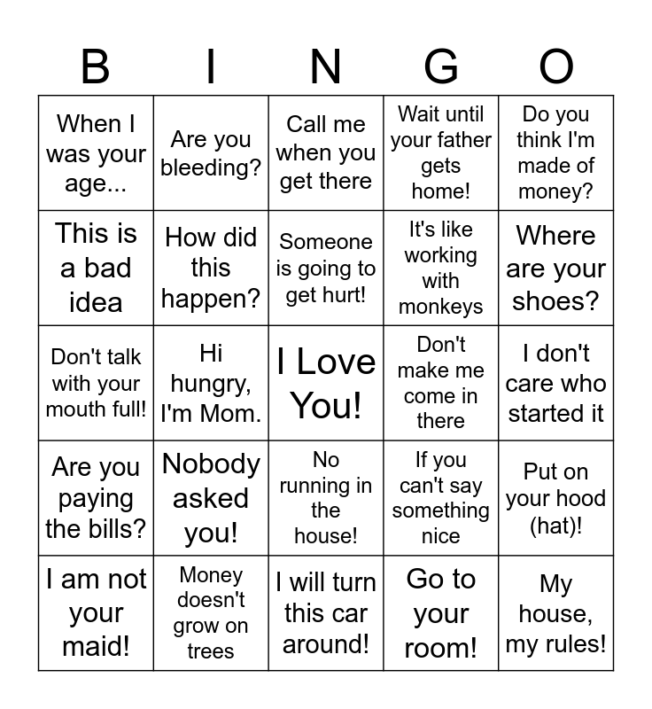 This bingo card has a free space and 44 words: Where are your shoes, My house, my rules!, You'll be fine, I am not your maid!, Look at me when I'm talking to you., Go to your room!, Call me when you get there, I'm going to count to 3!, Do you think I'm made of money?, Money doesn't grow on trees, Wait until your father gets home!, Don't make me come in there, No running in the house!, Nobody asked you!, Get out of my kitchen!, I will turn this car around!, Don't eat off the floor!, Don't talk with your mouth full!, I'm not paying to heat the outside!, Where are your shoes?, Are you bleeding?, It's fine - 5 second rule, Life isn't fair!, When I was your age..., Go ask your father!, I don't care who started it, This room looks like a pigsty!, The apple doesn't fall far from the tree, If you can't say something nice, Are you paying the bills?, Button up your coat!, Put on your hood (hat)!, What were you thinking?, You can't always get what you want, Hi hungry, I'm Mom., No shoes in the house, "I don't know" is not a meal, Go away, crazy!, Someone is going to get hurt!, This is a bad idea, It's like working with monkeys, I will wash your mouth out with soap!, How did this happen? and Is it going to clean itself?.