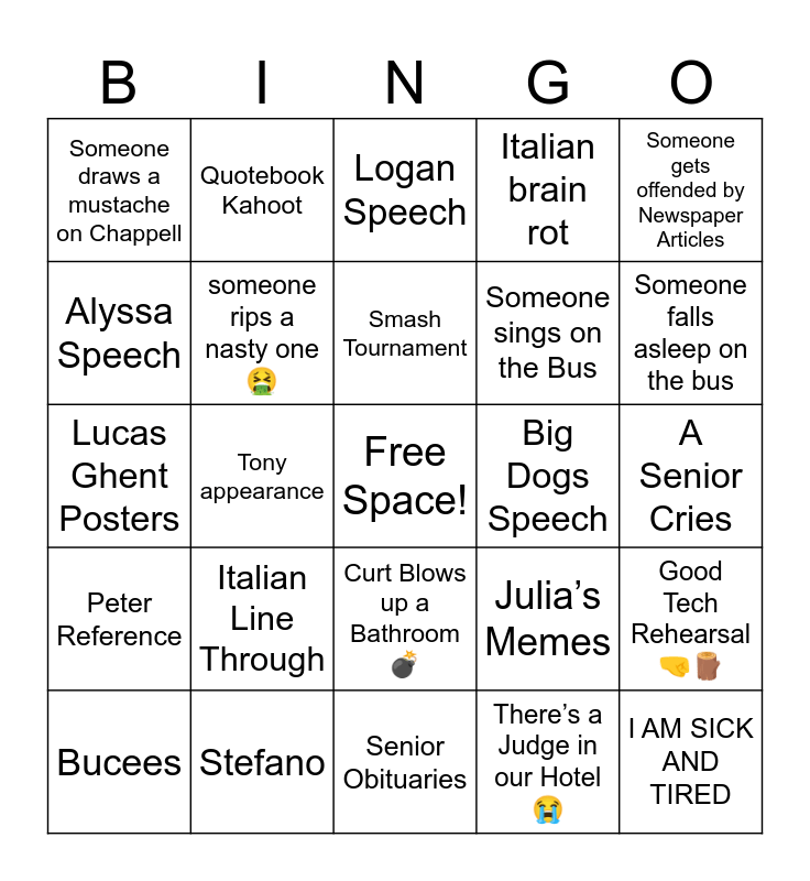 This bingo card has a free space and 24 words: Italian Line Through, Stefano, Smash Tournament, Bucees, Someone gets offended by Newspaper Articles, Someone draws a mustache on Chappell, Alyssa Speech, Quotebook Kahoot, Big Dogs Speech, Curt Blows up a Bathroom 💣, Someone sings on the Bus, Lucas Ghent Posters, Julia’s Memes, Good Tech Rehearsal 🤜🪵, someone rips a nasty one 🤮, There’s a Judge in our Hotel ðŸ˜, A Senior Cries, Logan Speech, Someone falls asleep on the bus, Tony appearance, I AM SICK AND TIRED, Peter Reference, Italian brain rot and Senior Obituaries.