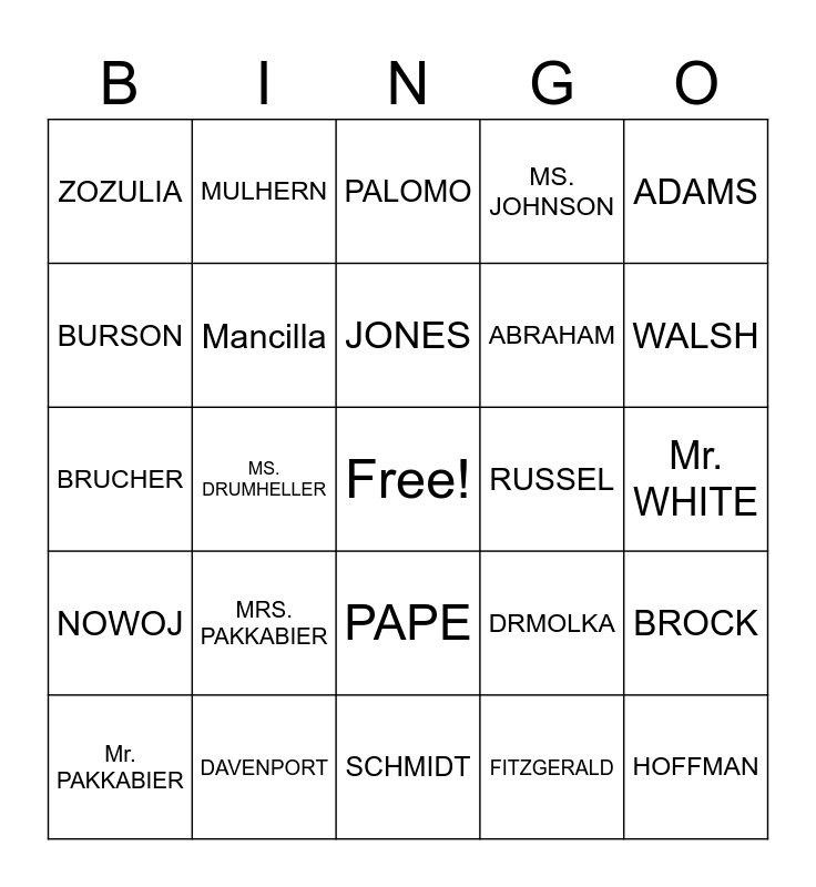 This bingo card has a free space and 26 words: PAPE, FITZGERALD, JONES, DAVENPORT, ADAMS, ZOZULIA, BURSON, MULHERN, Mr. WHITE, DRMOLKA, ABRAHAM, BRUCHER, BROCK, Mr. PAKKABIER, MS. DRUMHELLER, MS. ANNA, MS. JOHNSON, NOWOJ, PALOMO, HOFFMAN, WALSH, SCHMIDT, RUSSEL, MRS. PAKKABIER, Mancilla and Smid.