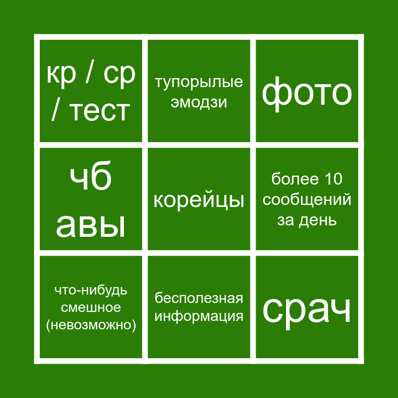 This bingo card has 12 words: дз (халява), срач, корейцы, более 10 сообщений за день, тупорылые эмодзи, фото, бесполезная информация, спам реакциями, кр / ср / тест, чб авы, что-нибудь смешное (невозможно) and макан💀.