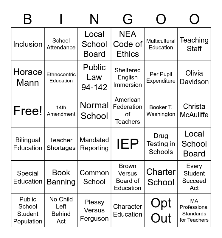 This bingo card has 36 words: Brown Versus Board of Education, Common School, Character Education, Horace Mann, Bilingual Education, American Federation of Teachers, Ethnocentric Education, Plessy Versus Ferguson, Multicultural Education, Charter School, Olivia Davidson, NEA Code of Ethics, Every Student Succeed Act, 14th Amendment, Sheltered English Immersion, Inclusion, Special Education, Booker T. Washington, Free!, Local School Board, Normal School, Teacher Shortages, IEP, Mandated Reporting, Drug Testing in Schools, School Attendance, Per Pupil Expenditure, No Child Left Behind Act, Public Law 94-142, Teaching Staff, MA Professional Standards for Teachers, Public School Student Population, Local School Board, Christa McAuliffe, Book Banning and Opt Out.