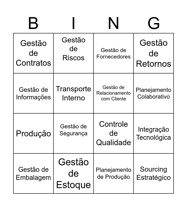 This bingo card has 16 words: Gestão de Estoque, Integração Tecnológica, Gestão de Fornecedores, Gestão de Contratos, Produção, Gestão de Riscos, Controle de Qualidade, Planejamento de Produção, Gestão de Informações, Transporte Interno, Gestão de Embalagem, Gestão de Retornos, Gestão de Segurança, Planejamento Colaborativo, Gestão de Relacionamento com Cliente and Sourcing Estratégico.
