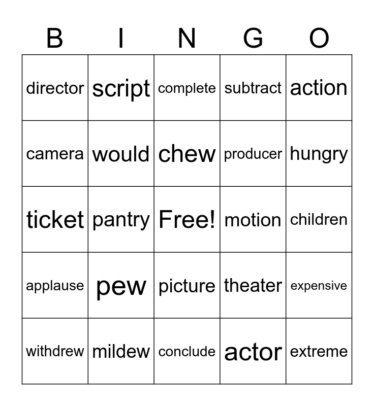 This bingo card has a free space and 24 words: pew, mildew, chew, withdrew, action, director, camera, script, motion, picture, producer, ticket, theater, expensive, would, actor, children, complete, hungry, pantry, extreme, applause, subtract and conclude.