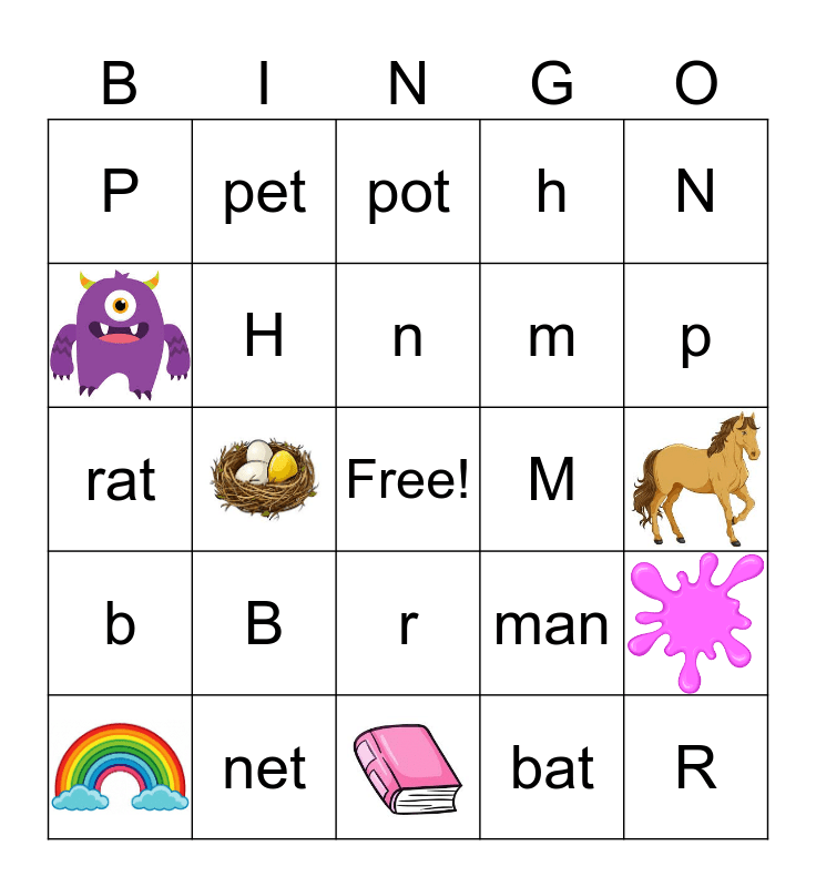This bingo card has 6 images, a free space and 18 words: B, net, n, N, P, pet, M, r, m, rat, man, H, bat, pot, p, R, b and h.