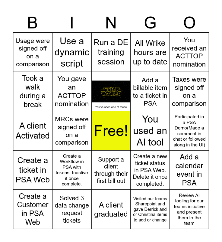 This bingo card has 1 images, a free space and 24 words: Create a Workflow in PSA with tokens. Inactive it once complete., Solved 3 data change request tickets, You've seen one of these, Create a Customer in PSA Web, You received an ACTTOP nomination, Usage were signed off on a comparison, Took a walk during a break, Use a dynamic script, You used an AI tool, Support a client through their first bill out, Add a billable item to a ticket in PSA, A client Activated, Create a new ticket status in PSA Web. Delete it once completed., Add a calendar event in PSA, You gave an ACTTOP nomination, Visited our teams Sharepoint and gave Derrick and or Christina items to add or change, Participated in a PSA Demo(Made a comment in chat or followed along in the UI), Run a DE training session, Taxes were signed off on a comparison, MRCs were signed off on a comparison, Review AI tooling for our teams initiative and present them to the team, Create a ticket in PSA Web, All Wrike hours are up to date and A client graduated.