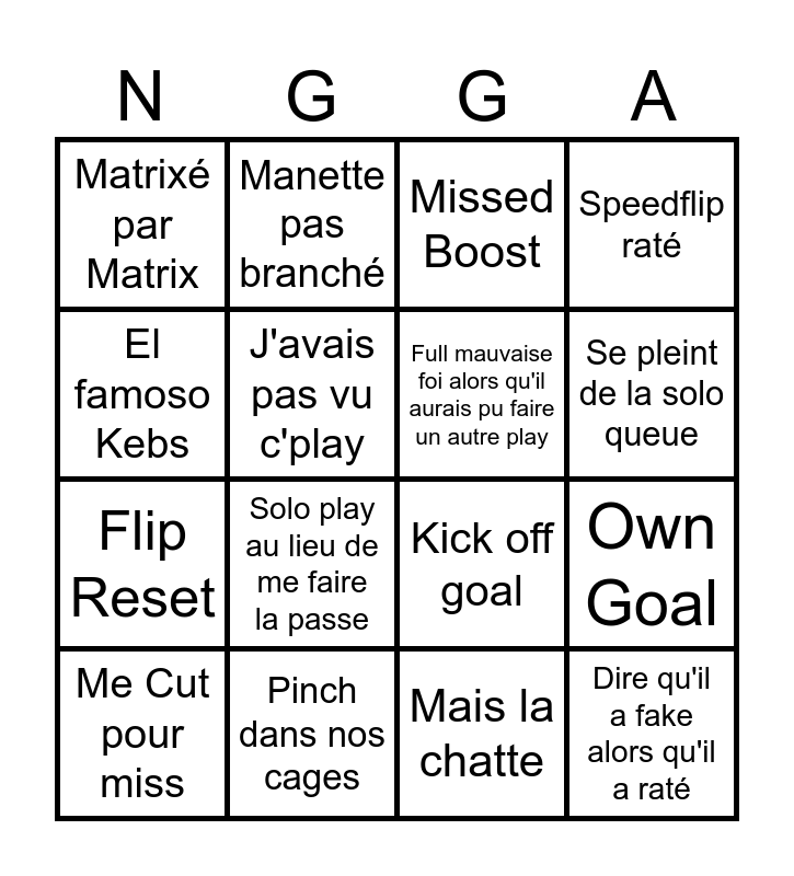 This bingo card has 16 words: Pinch dans nos cages, Own Goal, Missed Boost, Matrixé par Matrix, Flip Reset, Manette pas branché, Kick off goal, Mais la chatte, El famoso Kebs, J'avais pas vu c'play, Me Cut pour miss, Speedflip raté, Solo play au lieu de me faire la passe, Se pleint de la solo queue, Full mauvaise foi alors qu'il aurais pu faire un autre play and Dire qu'il a fake alors qu'il a raté.