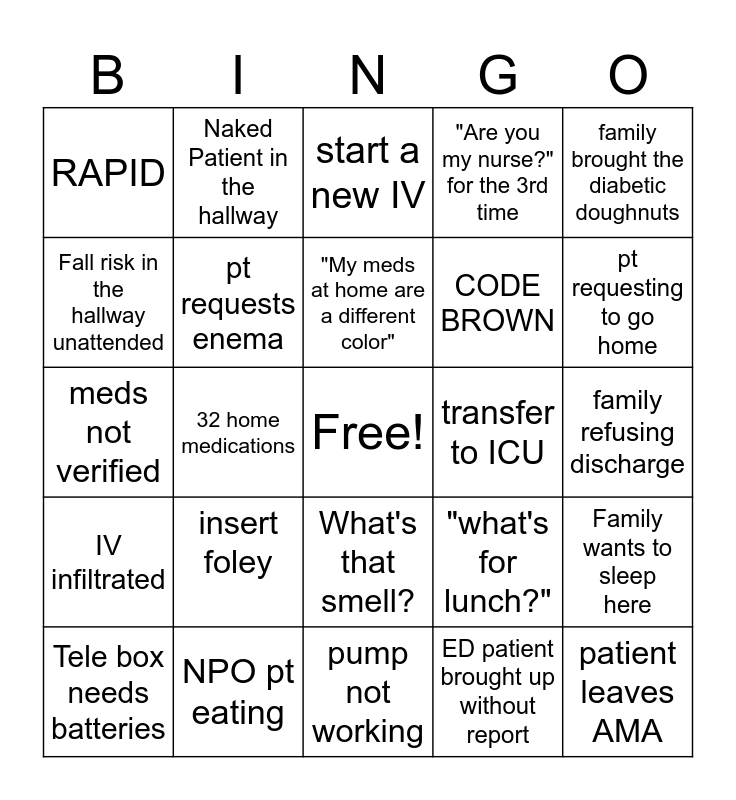 This bingo card has a free space and 26 words: What's that smell?, ED patient brought up without report, "My meds at home are a different color", NPO pt eating, family brought the diabetic doughnuts, RAPID, Fall risk in the hallway unattended, Naked Patient in the hallway, family refusing discharge, "what's for lunch?", CODE BROWN, meds not verified, Family wants to sleep here, Tele box needs batteries, 32 home medications, Allergic to all pain meds except dilauded, "Are you my nurse?" for the 3rd time, IV infiltrated, start a new IV, patient leaves AMA, pt requesting to go home, pump not working, transfer to ICU, insert foley, pt requests enema and mama needs a sitter.