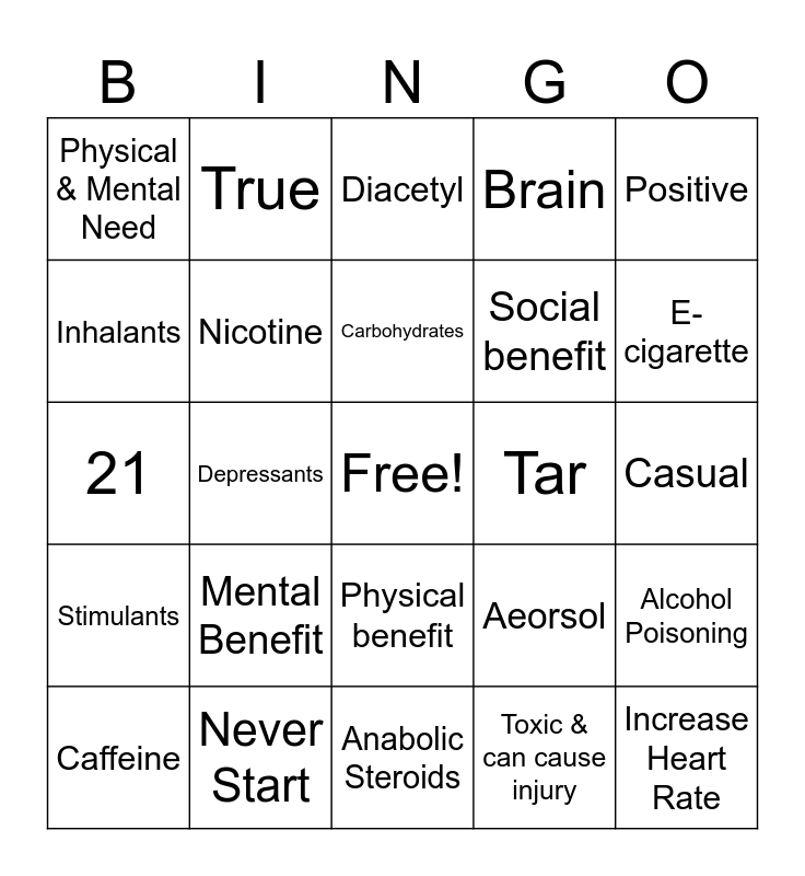 This bingo card has a free space and 24 words: Mental Benefit, Never Start, Carbohydrates, Caffeine, Positive, Physical & Mental Need, Inhalants, True, Tar, Physical benefit, Social benefit, 21, Aeorsol, Alcohol Poisoning, Nicotine, Toxic & can cause injury, Casual, Diacetyl, E-cigarette, Depressants, Increase Heart Rate, Stimulants, Brain and Anabolic Steroids.