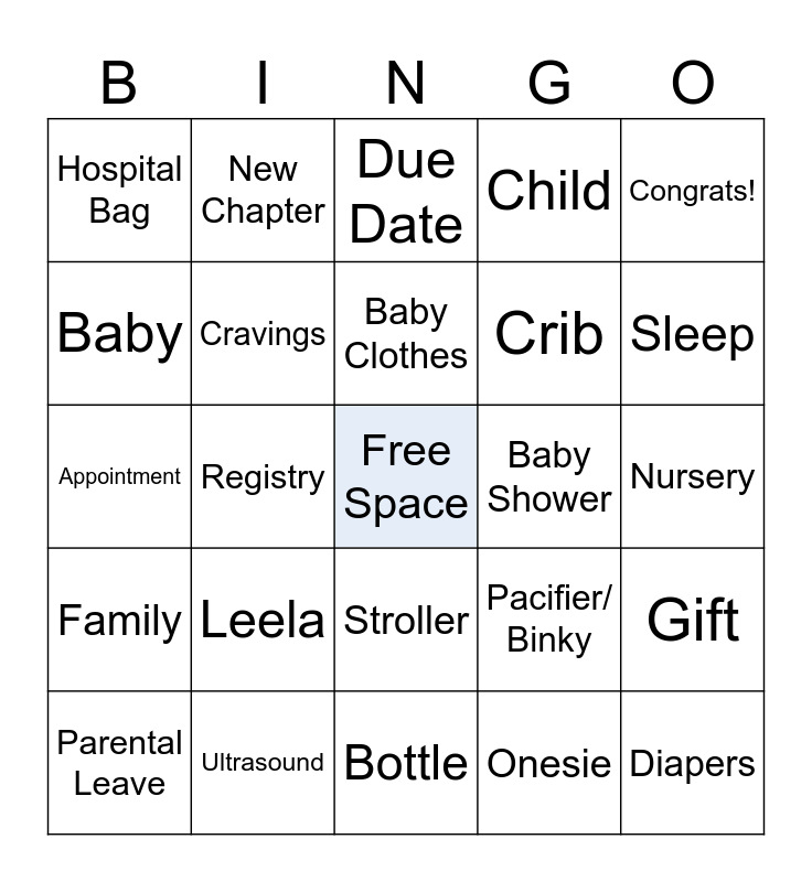This bingo card has a free space and 29 words: Parental Leave, Parents, Registry, Car Seat, Hospital Bag, Due Date, Cravings, Leela, Baby Shower, Ultrasound, Nursery, Diapers, Bottle, Onesie, Sleep, Gift, Stroller, Family, Congrats!, Appointment, Pacifier/ Binky, Baby Name, Crib, Baby, Child, New Chapter, Gift, Baby Clothes and Newborn.