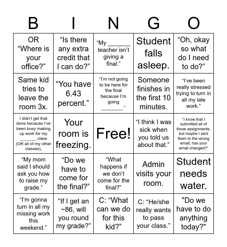 This bingo card has a free space and 34 words: “My parent wanted me to ask you if I can still turn this in.”, C: “He/she really wants to pass your class.”, “What’s the lowest grade I can get on the final and still pass?”, Re: a September assignment “It’s locked in Canvas; can you open it?”, “My mom said I should ask you how to raise my grade.”, “You have 6.43 percent.”, “Oh, okay so what do I need to do?”, “I’m gonna turn in all my missing work this weekend.”, “Is there any extra credit that I can do?”, “I can’t afford to get below a ___.”, “I’m not going to be here for the final because I’m going ________.”, “My _______ teacher isn’t giving a final.”, “I’m going to Romania this summer, so I can’t go to summer school.”, “What is the last day I can turn this in and still get full credit?”, “I think I was sick when you told us about that.”, “I’ve been really stressed trying to turn in all my late work.”, “If I get an ~86, will you round my grade?”, I didn’t get that done because I’ve been busy making up work for my _______ class (OR all of my other classes),, “Do we have to come for the final?”, Admin visits your room., “What happens if we don’t come for the final?”, “Where is Mr./Ms. _____’s desk?”, OR “Where is your office?”, “I know that I submitted all of those assignments, but maybe I sent them to the wrong email; has your email changed?”, C: “What can we do for this kid?”, "Do we have to do anything today?", Student falls asleep., It's a 1,000,000 degrees in your classroom., Someone finishes in the first 10 minutes., Same kid tries to leave the room 3x., Student surprised that the test "counts", Your room is freezing., Student needs water. and Student asks to text mom/dad..