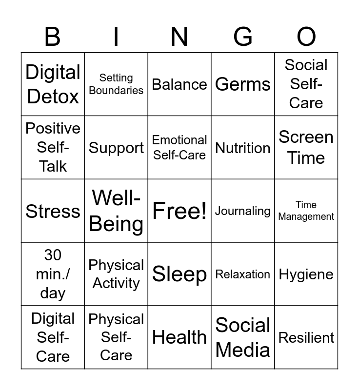 This bingo card has a free space and 24 words: Physical Activity, Physical Self-Care, Emotional Self-Care, Digital Self-Care, Social Self-Care, Digital Detox, Positive Self-Talk, Setting Boundaries, Journaling, Sleep, Nutrition, Stress, Relaxation, Hygiene, Support, Social Media, Time Management, Balance, Screen Time, Well-Being, Resilient, 30 min./ day, Germs and Health.