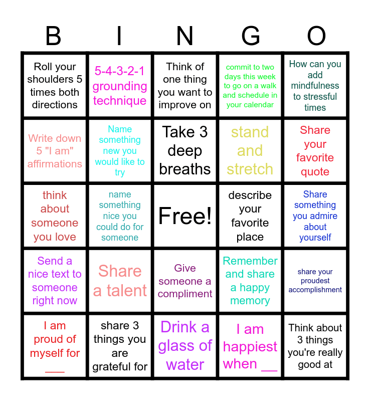 This bingo card has a free space and 24 words: Share a talent, share 3 things you are grateful for, Take 3 deep breaths, I am proud of myself for ___, How can you add mindfulness to stressful times, Roll your shoulders 5 times both directions, Write down 5 "I am" affirmations, 5-4-3-2-1 grounding technique, describe your favorite place, Give someone a compliment, stand and stretch, think about someone you love, Remember and share a happy memory, share your proudest accomplishment, Name something new you would like to try, I am happiest when __, Share something you admire about yourself, Think of one thing you want to improve on, Share your favorite quote, name something nice you could do for someone, Think about 3 things you're really good at, Send a nice text to someone right now, commit to two days this week to go on a walk and schedule in your calendar and Drink a glass of water.