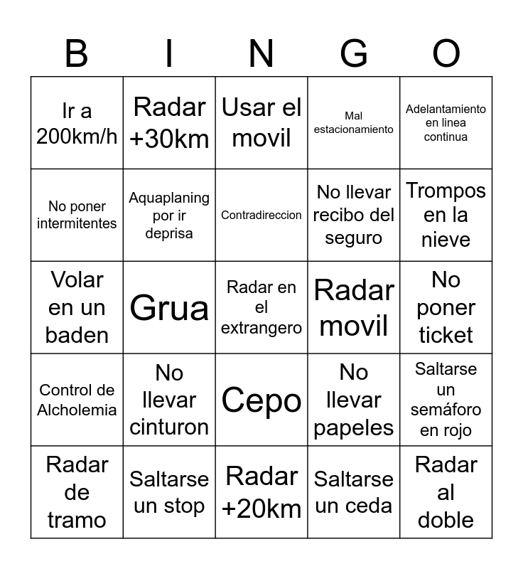 This bingo card has a free space and 24 words: Radar de tramo, No llevar cinturon, Contradireccion, Saltarse un ceda, Adelantamiento en linea continua, Ir a 200km/h, Radar +30km, Usar el movil, Radar movil, No poner ticket, Volar en un baden, Aquaplaning por ir deprisa, No llevar papeles, Saltarse un semáforo en rojo, No poner intermitentes, Saltarse un stop, Radar +20km, Mal estacionamiento, Trompos en la nieve, Control de Alcholemia, Grua, Cepo, No llevar recibo del seguro and Radar al doble.