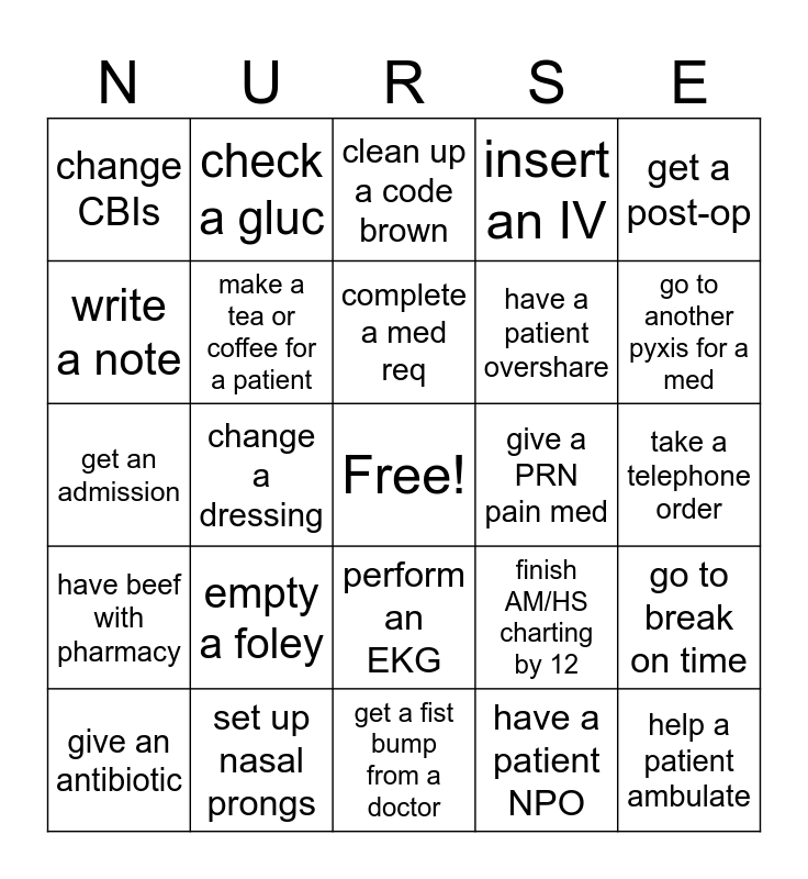 This bingo card has a free space and 24 words: empty a foley, set up nasal prongs, complete a med req, give an antibiotic, get a post-op, change CBIs, write a note, check a gluc, give a PRN pain med, perform an EKG, have a patient overshare, get an admission, finish AM/HS charting by 12, go to break on time, make a tea or coffee for a patient, have a patient NPO, take a telephone order, clean up a code brown, go to another pyxis for a med, change a dressing, help a patient ambulate, have beef with pharmacy, insert an IV and get a fist bump from a doctor.