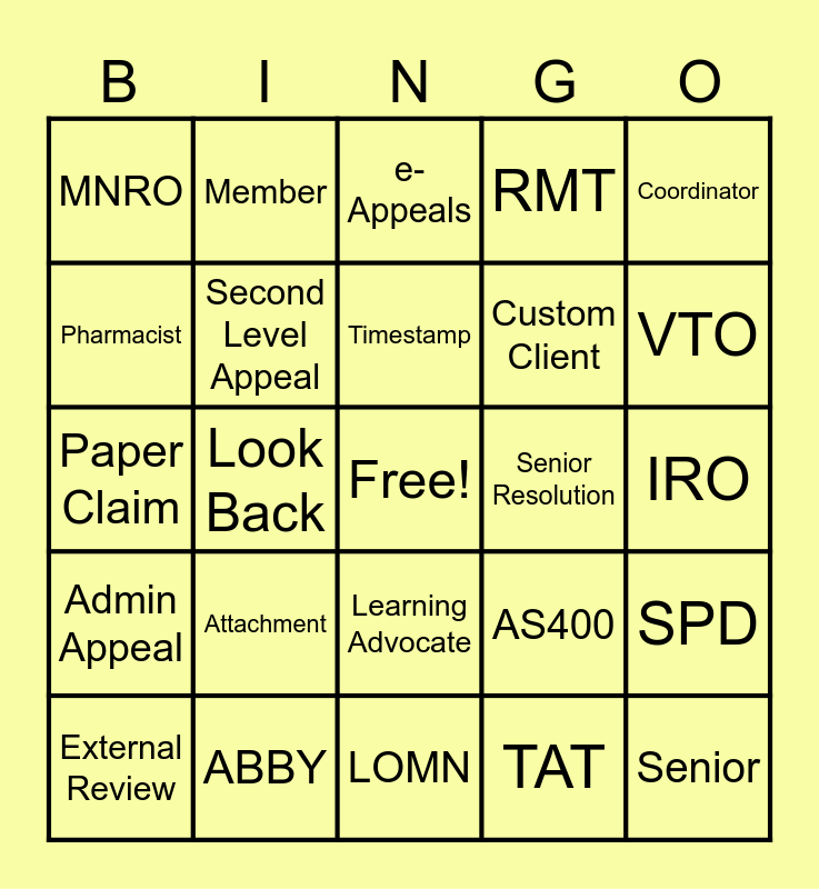 This bingo card has a free space and 55 words: Appeal, External Review, Coverage Determination, MNRO, LOMN, First Leve Appeal, Second Level Appeal, Non-Custom, Custom Client, Member Consent, RMT, Urgent, ASAP, The Source, Tech, Rep, Coordinator, Look Back, Peer to Peer, Senior, Senior Resolution, CAS, AS400, e-Appeals, Mock Claim, Timestamp, TAT, Compound, IRO, SPD, DFS, Not A PA Client, HIPAA, Work Instruction, Pharmacist, Paper Claim, Plan Exclusion, Admin Appeal, Follow up, Attestation, Member, Call Notes, PA Notes, Member Notes, Attachment, ABBY, UIpath, Verint, Five9, VTO, PTO, Early Out, Supervisor, Learning Advocate and Trainer.