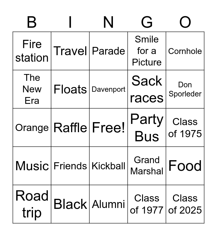 This bingo card has a free space and 31 words: Alumni, Banquet, Raffle, Broadway, Fire station, Parade, Floats, Grand Marshal, Party Bus, Class of 1977, Class of 1975, Class of 2025, Seniors, Reunion, Don Sporleder, Charlie Tipton, Food, Friends, Music, Kickball, Cornhole, Horseshoes, Road trip, Travel, Sack races, The New Era, Smile for a Picture, Orange, Black, Davenport and Bulldogs.