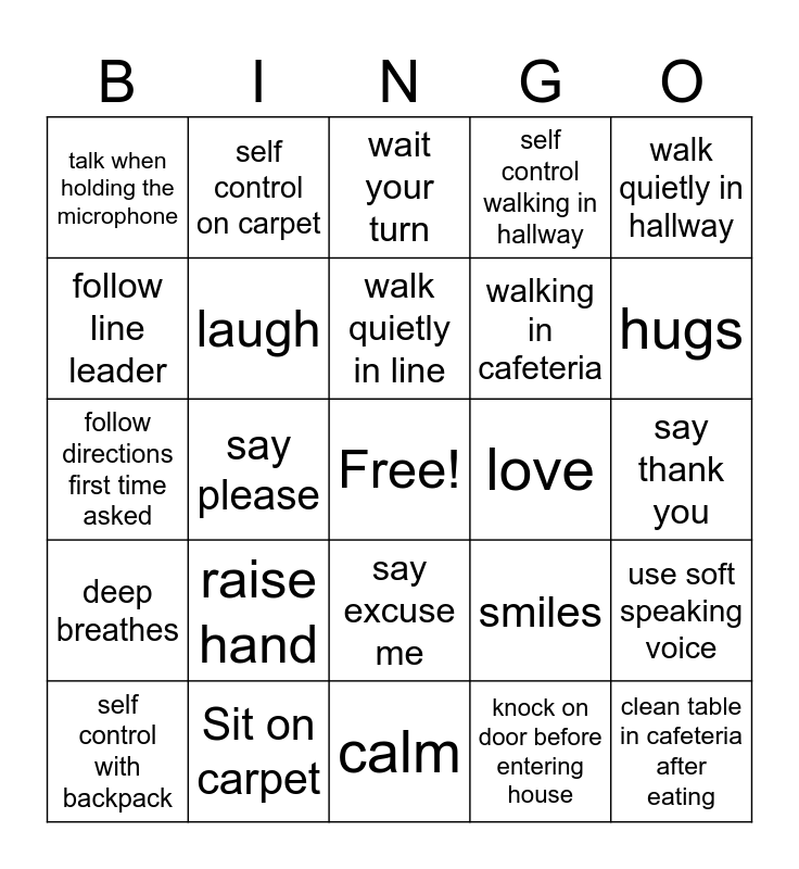 This bingo card has a free space and 24 words: raise hand, Sit on carpet, walk quietly in line, self control with backpack, walk quietly in hallway, talk when holding the microphone, follow line leader, self control on carpet, love, say excuse me, walking in cafeteria, follow directions first time asked, smiles, use soft speaking voice, laugh, knock on door before entering house, say thank you, wait your turn, hugs, say please, clean table in cafeteria after eating, deep breathes, self control walking in hallway and calm.