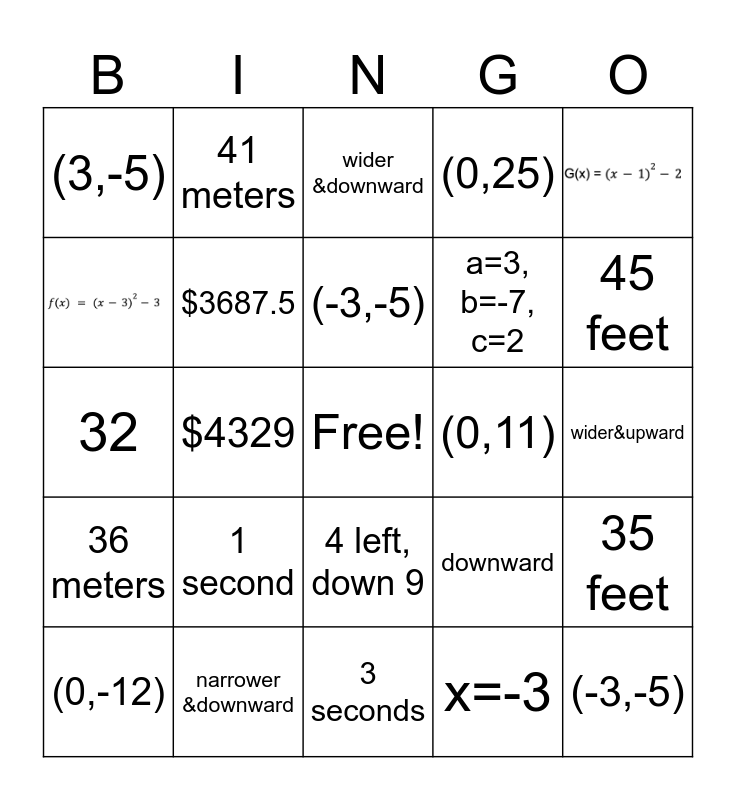 This bingo card has 2 images, a free space and 22 words: 1 second, narrower &downward, (-3,-5), (0,-12), (3,-5), 41 meters, (0,11), 4 left, down 9, a=3, b=-7, c=2, 32, downward, 35 feet, $3687.5, x=-3, wider&upward, wider &downward, 45 feet, $4329, (-3,-5), 36 meters, (0,25) and 3 seconds.