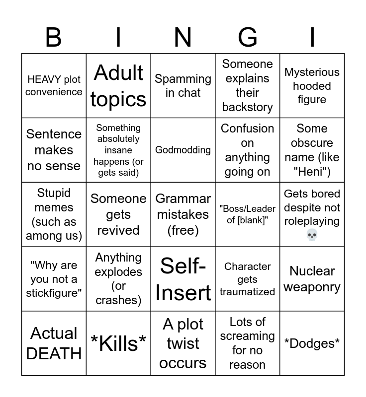 This bingo card has a free space and 24 words: Anything explodes (or crashes), *Kills*, Godmodding, Actual DEATH, Mysterious hooded figure, HEAVY plot convenience, Sentence makes no sense, Adult topics, "Boss/Leader of [blank]", Self-Insert, Confusion on anything going on, Stupid memes (such as among us), Character gets traumatized, Nuclear weaponry, Something absolutely insane happens (or gets said), Lots of screaming for no reason, Gets bored despite not roleplaying 💀, Spamming in chat, Some obscure name (like "Heni"), Someone gets revived, *Dodges*, "Why are you not a stickfigure", Someone explains their backstory and A plot twist occurs.