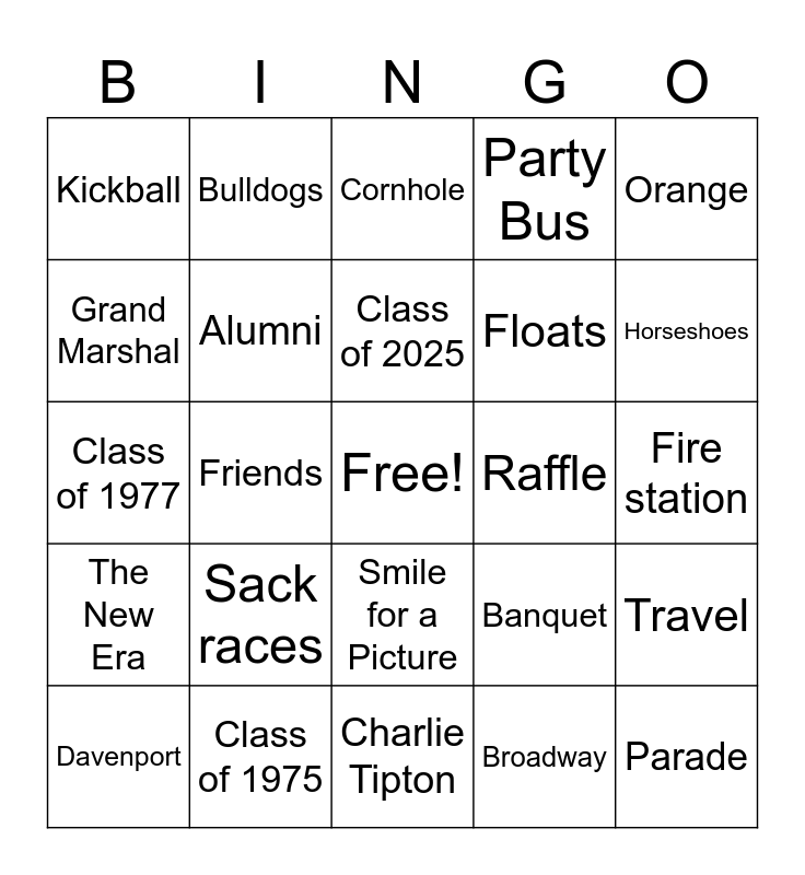 This bingo card has a free space and 31 words: Charlie Tipton, Food, Friends, Music, Kickball, Cornhole, Alumni, Banquet, Raffle, Broadway, Fire station, Parade, Reunion, Don Sporleder, Horseshoes, Road trip, Travel, Sack races, The New Era, Smile for a Picture, Orange, Black, Davenport, Bulldogs, Floats, Grand Marshal, Party Bus, Class of 1977, Class of 1975, Class of 2025 and Seniors.