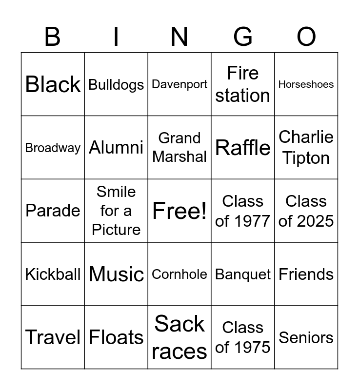 This bingo card has a free space and 31 words: Sack races, The New Era, Smile for a Picture, Orange, Black, Davenport, Alumni, Banquet, Class of 1977, Class of 1975, Class of 2025, Seniors, Reunion, Don Sporleder, Charlie Tipton, Food, Friends, Music, Kickball, Cornhole, Horseshoes, Road trip, Travel, Bulldogs, Raffle, Broadway, Fire station, Parade, Floats, Grand Marshal and Party Bus.