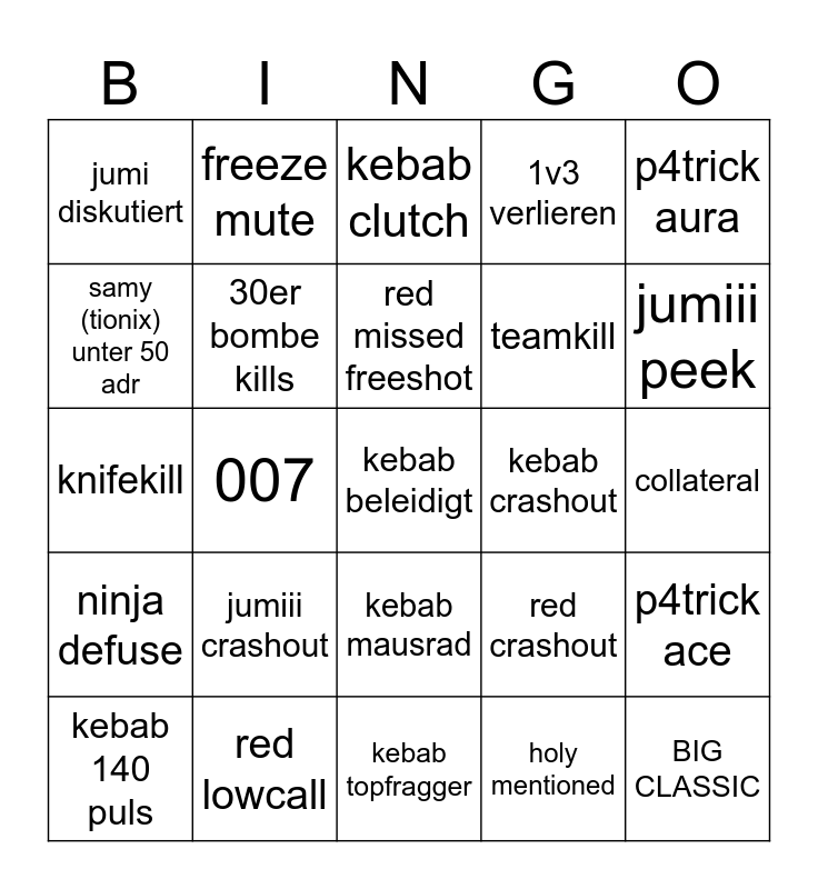 This bingo card has a free space and 24 words: jumiii crashout, red lowcall, red missed freeshot, kebab 140 puls, p4trick aura, jumi diskutiert, samy (tionix) unter 50 adr, freeze mute, kebab crashout, kebab mausrad, teamkill, knifekill, red crashout, p4trick ace, 30er bombe kills, holy mentioned, collateral, kebab clutch, jumiii peek, 007, BIG CLASSIC, ninja defuse, 1v3 verlieren and kebab topfragger.