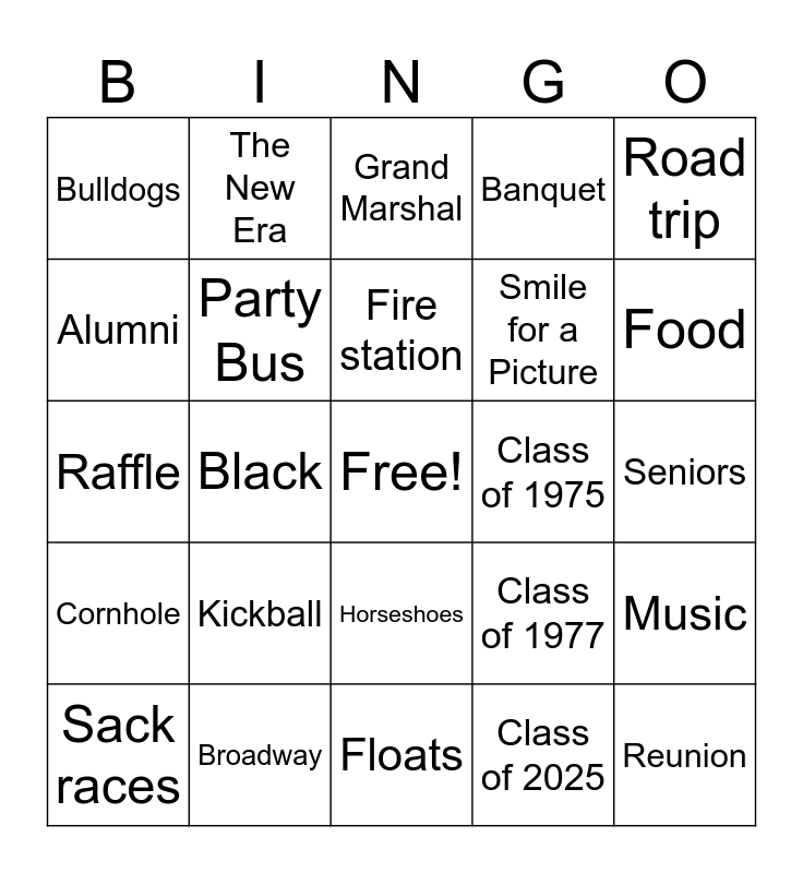 This bingo card has a free space and 31 words: Floats, Orange, Black, Davenport, Bulldogs, Grand Marshal, Party Bus, Class of 1977, Class of 1975, Class of 2025, Seniors, Reunion, Don Sporleder, Charlie Tipton, Food, Friends, Music, Kickball, Cornhole, Horseshoes, Road trip, Travel, Sack races, The New Era, Smile for a Picture, Alumni, Banquet, Raffle, Broadway, Fire station and Parade.