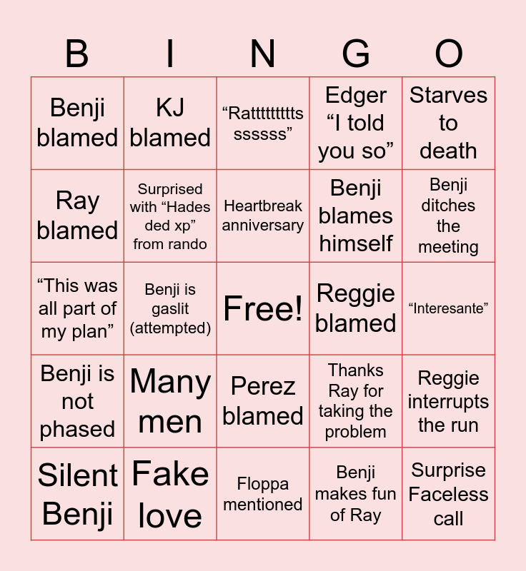 This bingo card has a free space and 24 words: Many men, Fake love, Heartbreak anniversary, Silent Benji, Starves to death, Benji blamed, Ray blamed, KJ blamed, Reggie blamed, Perez blamed, Benji blames himself, “This was all part of my plan”, Thanks Ray for taking the problem, Reggie interrupts the run, Surprised with “Hades ded xp” from rando, Benji makes fun of Ray, “Interesante”, “Rattttttttts ssssss”, Benji ditches the meeting, Benji is gaslit (attempted), Surprise Faceless call, Benji is not phased, Edger “I told you so” and Floppa mentioned.