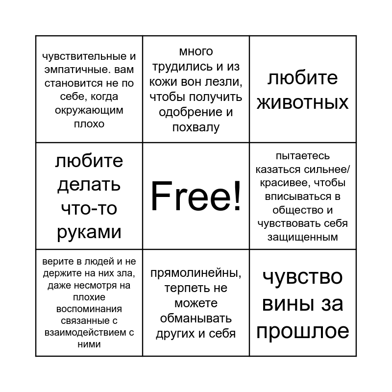 This bingo card has a free space and 8 words: пытаетесь казаться сильнее/красивее, чтобы вписываться в общество и чувствовать себя защищенным, любите животных, много трудились и из кожи вон лезли, чтобы получить одобрение и похвалу, верите в людей и не держите на них зла, даже несмотря на плохие воспоминания связанные с взаимодействием с ними, чувствительные и эмпатичные. вам становится не по себе, когда окружающим плохо, чувство вины за прошлое, любите делать что-то руками and прямолинейны, терпеть не можете обманывать других и себя.