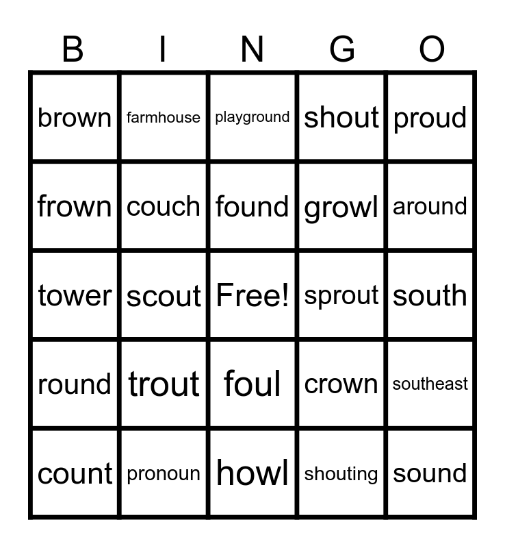 This bingo card has a free space and 39 words: bounce, bound, cloud, couch, count, foul, found, pouch, proud, round, scout, shout, sound, south, sprout, trout, brow, brown, clown, crown, frown, howl, growl, around, compound, cowboy, downhill, downtown, eyebrow, farmhouse, household, outdoor, playground, pronoun, shouting, shower, southeast, tower and without.