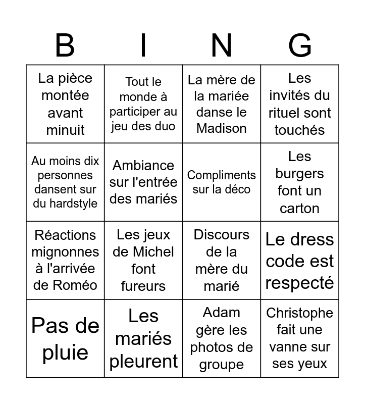 This bingo card has 16 words: Les mariés pleurent, Le dress code est respecté, La mère de la mariée danse le Madison, La pièce montée avant minuit, Réactions mignonnes à l'arrivée de Roméo, Tout le monde à participer au jeu des duo, Discours de la mère du marié, Adam gère les photos de groupe, Au moins dix personnes dansent sur du hardstyle, Ambiance sur l'entrée des mariés, Pas de pluie, Les invités du rituel sont touchés, Les jeux de Michel font fureurs, Les burgers font un carton, Compliments sur la déco and Christophe fait une vanne sur ses yeux.