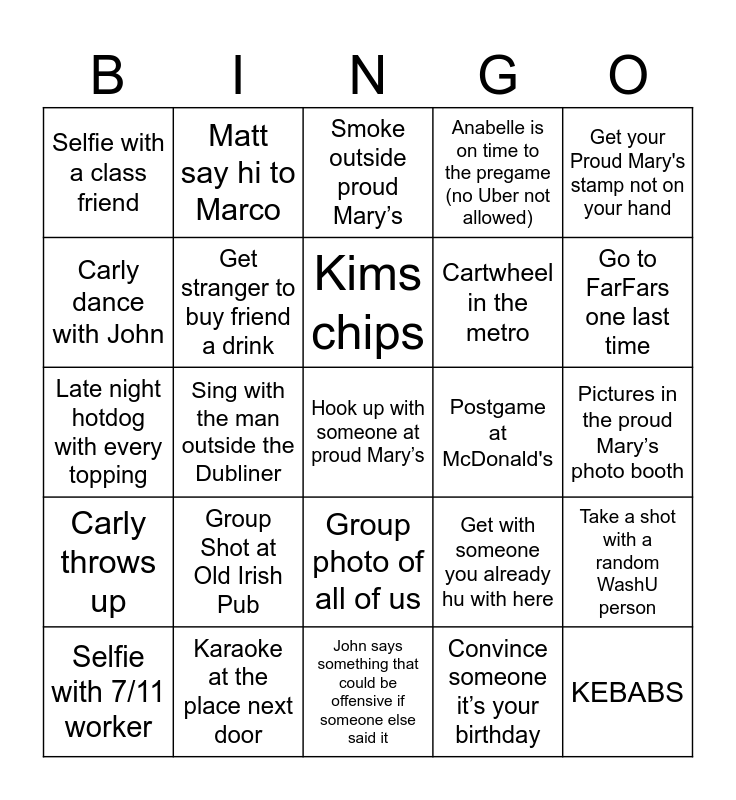 This bingo card has a free space and 24 words: Group Shot at Old Irish Pub, Karaoke at the place next door, Kims chips, Selfie with 7/11 worker, Get your Proud Mary's stamp not on your hand, Selfie with a class friend, Carly dance with John, Matt say hi to Marco, Postgame at McDonald's, Group photo of all of us, Cartwheel in the metro, Late night hotdog with every topping, Get with someone you already hu with here, Take a shot with a random WashU person, Get stranger to buy friend a drink, Convince someone it’s your birthday, Pictures in the proud Mary’s photo booth, Smoke outside proud Mary’s, Go to FarFars one last time, Sing with the man outside the Dubliner, KEBABS, Carly throws up, Anabelle is on time to the pregame (no Uber not allowed) and John says something that could be offensive if someone else said it.