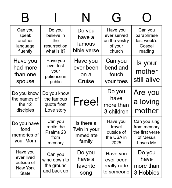 This bingo card has a free space and 24 words: Can you recite the Psalms 23 from memory, Can you wine down to the ground and back up, Have you ever been on a Cruise, Have you ever lived outside of New York State, Can you paraphrase last week’s Gospel reading, Can you speak another language fluently, Have you had more than one spouse, Do you believe in the resurrection what is it?, Do you have more than 3 children, Is there a Twin in your immediate family, Can you bend and touch your toes, Do you know the names of the 12 disciples, Have you travel outside of the USA in 2025, Can you sing from memory the first verse of “Jesus Loves Me, Have you ever lost your patience in public, Have you ever been really rude to someone, Are you a loving mother, Do you have a famous bible verse, Is your mother still alive, Do you know the famous quote from Love story, Do you have more than 3 Hobbies, Do you have fond memories of your Mom, Have you ever served on the vestry of your church and Do you have a favorite song.