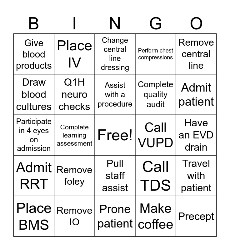 This bingo card has a free space and 25 words: Remove foley, Prone patient, Assist with a procedure, Place BMS, Remove central line, Give blood products, Draw blood cultures, Place IV, Call VUPD, Pull staff assist, Complete quality audit, Participate in 4 eyes on admission, Call TDS, Travel with patient, Q1H neuro checks, Wound care, Have an EVD drain, Change central line dressing, Admit patient, Complete learning assessment, Precept, Remove IO, Admit RRT, Perform chest compressions and Make coffee.