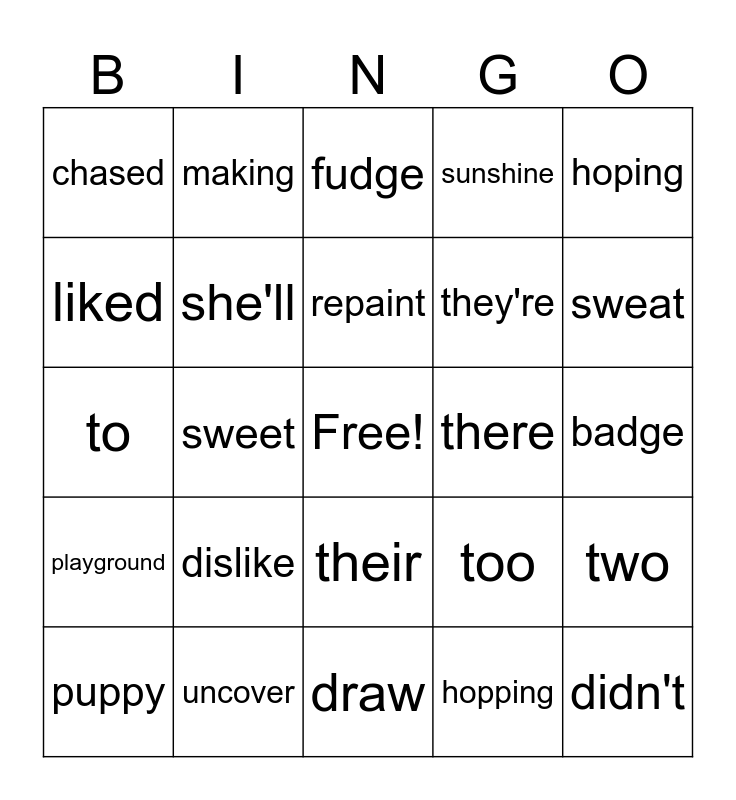 This bingo card has a free space and 24 words: dislike, uncover, repaint, puppy, hoping, chased, liked, making, there, their, they're, to, too, two, she'll, hopping, badge, fudge, sweat, sweet, didn't, playground, sunshine and draw.