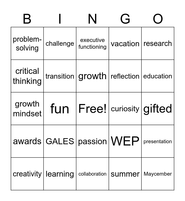 This bingo card has a free space and 24 words: GALES, learning, growth, creativity, research, problem-solving, critical thinking, challenge, curiosity, passion, reflection, growth mindset, WEP, presentation, transition, summer, gifted, executive functioning, education, fun, Maycember, awards, vacation and collaboration.