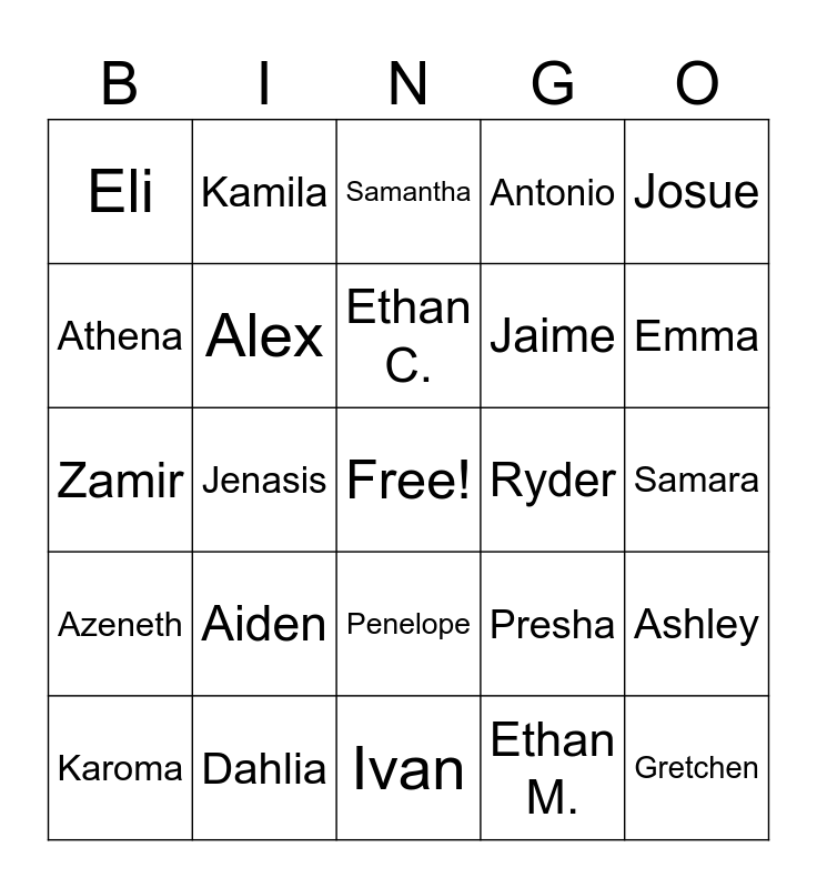 This bingo card has a free space and 24 words: Aiden, Dahlia, Ethan C., Karoma, Josue, Eli, Athena, Kamila, Ryder, Penelope, Jaime, Zamir, Presha, Ashley, Alex, Ethan M., Samara, Samantha, Emma, Jenasis, Gretchen, Azeneth, Antonio and Ivan.