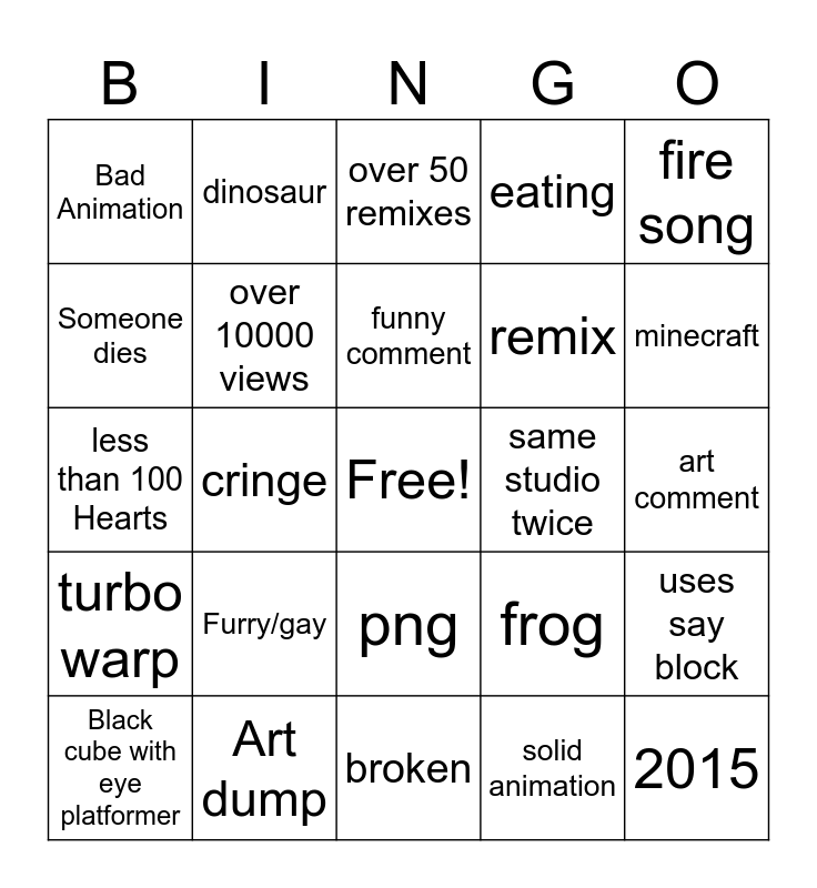This bingo card has a free space and 24 words: Furry/gay, Art dump, funny comment, Black cube with eye platformer, fire song, Bad Animation, Someone dies, dinosaur, same studio twice, png, remix, less than 100 Hearts, frog, uses say block, over 10000 views, solid animation, art comment, over 50 remixes, minecraft, cringe, 2015, turbo warp, eating and broken.