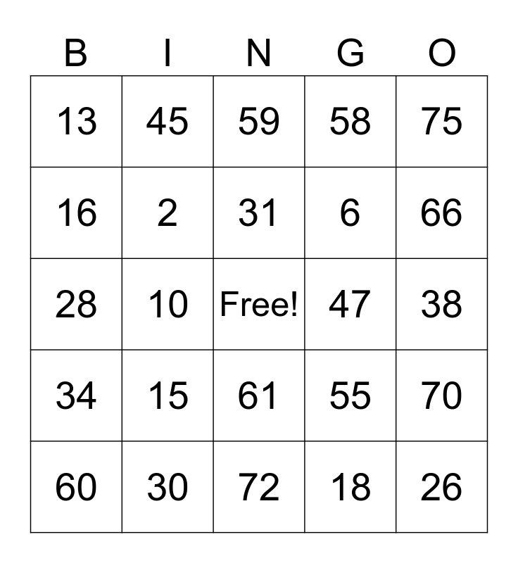 This bingo card has a free space and 24 words: 15, 30, 31, 60, 75, 13, 16, 45, 47, 61, 6, 28, 55, 70, 2, 18, 38, 59, 66, 10, 26, 34, 58 and 72.