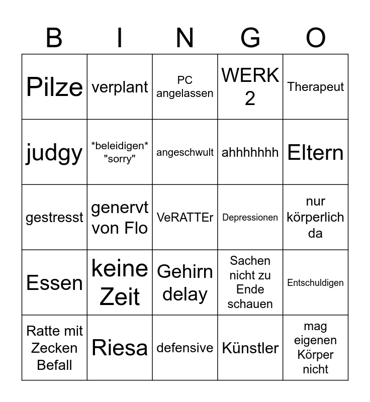 This bingo card has a free space and 24 words: keine Zeit, Riesa, angeschwult, Ratte mit Zecken Befall, Therapeut, Pilze, judgy, verplant, Depressionen, Gehirn delay, ahhhhhhh, gestresst, Sachen nicht zu Ende schauen, Entschuldigen, *beleidigen* "sorry", Künstler, nur körperlich da, PC angelassen, Eltern, genervt von Flo, mag eigenen Körper nicht, Essen, WERK 2 and defensive.